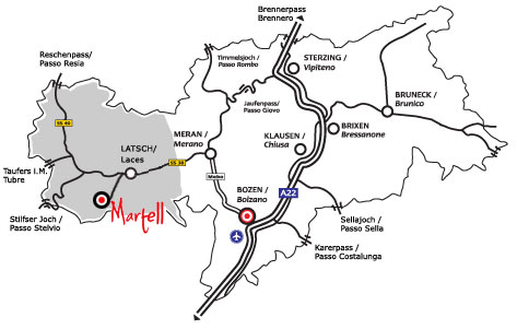 Folgen Sie der Hauptstraße immer in Richtung Martell Dorf. In der Ortschaft Gand biegen Sie an der Kreuzung rechts ab und folgen der Straße weiter bis ins Dorf. Uns finden Sie gleich 100m weiter nach der Kirche. Folgen Sie dann der Beschilderung zum Gasthof Edelweiss.